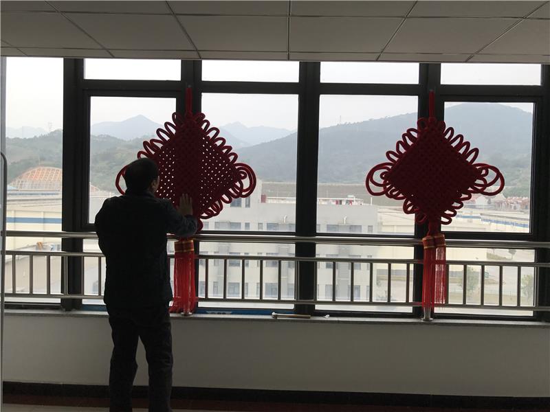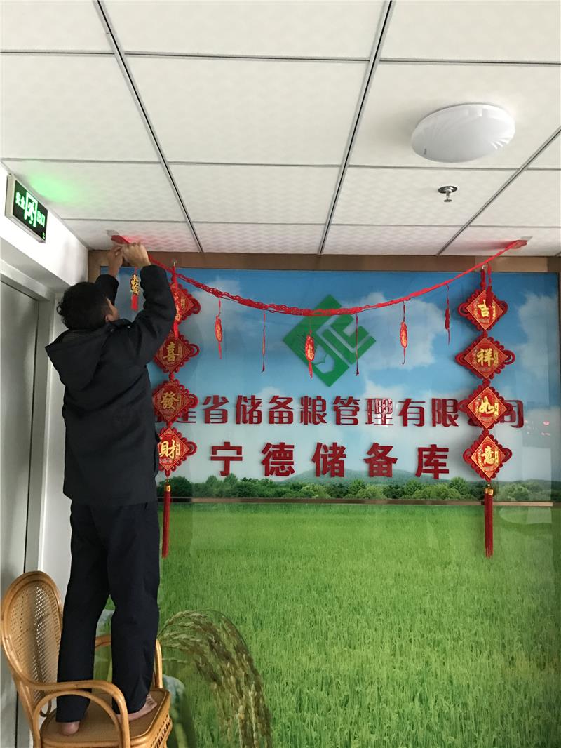 在送祝福的同時,寧德庫員工如火如荼的開展營造“迎新春”活動。一是對庫區(qū)衛(wèi)生進行大清潔,用高壓水槍徹底清洗去因進倉沉積在倉外四周的灰塵,讓庫區(qū)環(huán)境以整潔,干凈、有序的新面貌迎接新的一年。二是布置裝飾辦公樓,在一樓大廳前懸掛紅燈籠,粘貼春聯(lián),LED滾動屏設置“歡度春節(jié)”字幕,營造春節(jié)喜慶氛圍。辦公樓懸掛中國結,粘貼“?!辟N,寓意寧德庫像中國結一樣團結美滿,吉祥如意。