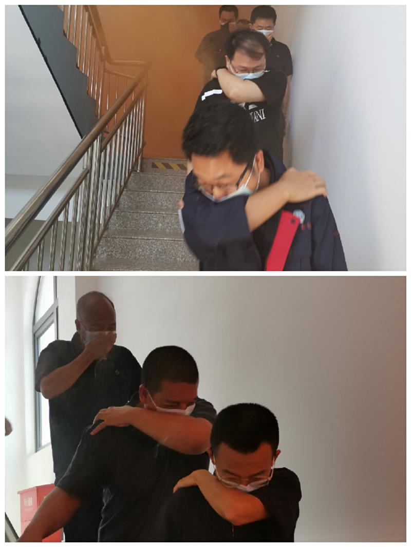 火災(zāi)警報響起后,疏散警戒組引導(dǎo)綜合辦公樓全體工作人員從安全通道緊張有序向廣場疏散,撤離完畢后由疏散警戒組組長向指揮部報告火場疏散情況,總指揮根據(jù)“先救人后救火”原則下達火場搜救(滅火)指令。