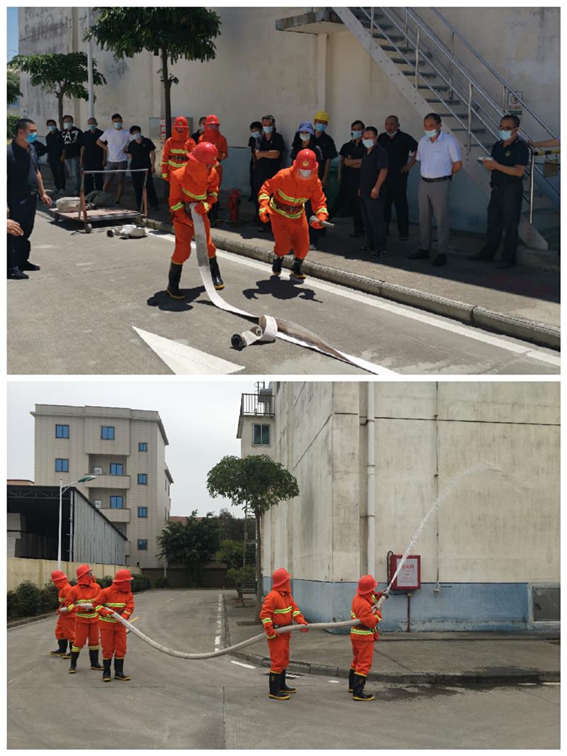 模擬25號倉庫(糧食)著火,安全技術(shù)專家現(xiàn)場指導(dǎo)消防水帶甩帶、連接及盤卷訓(xùn)練,訓(xùn)練后搶險救災(zāi)組成員均能在14秒內(nèi)完成水帶連接及出水。