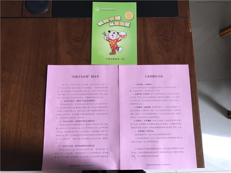 為深入貫徹落實習近平總書記關于制止餐飲浪費行為的重要指示精神,寧德儲備庫積極響應省糧儲局和省公司的號召,迅速安排部署黨員干部職工與三樂村黨支部攜手開展“珍惜盤中餐,狠剎浪費風”宣傳活動,向糧油米鋪、等候公交車及路邊的村民發(fā)放“拒絕舌尖浪費”倡議書、大米的保存方法等宣傳資料,引導村民文明用餐,健康飲食,對餐飲浪費行為說“不”。我們還利用微信、微博、庫區(qū)宣傳欄、LED屏大力宣傳“愛糧節(jié)糧,反對浪費”的思想觀念,營造浪費可恥、節(jié)約為榮的氛圍。