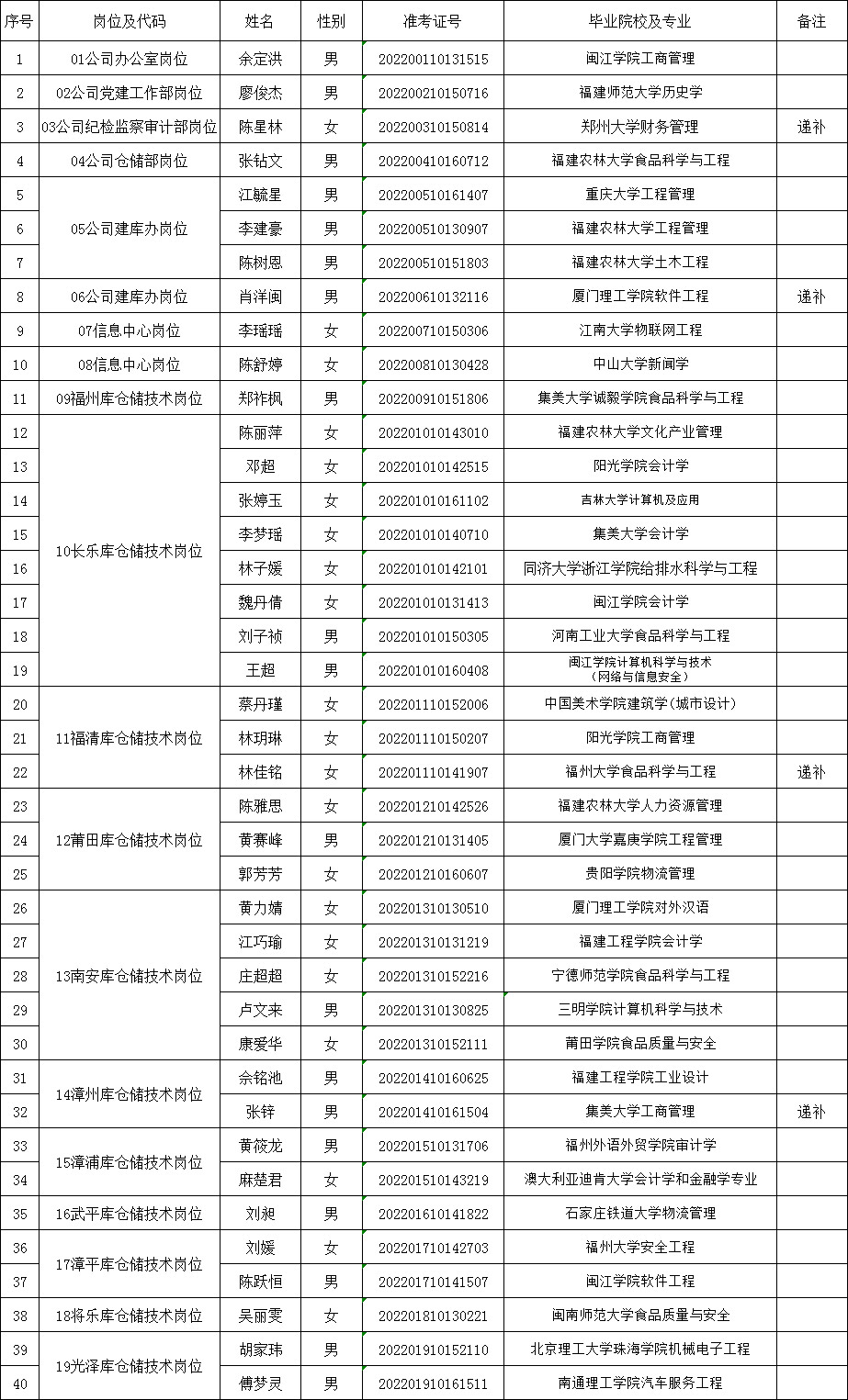 根據(jù)《2022年福建省儲(chǔ)備糧管理有限公司招聘工作人員方案》,經(jīng)報(bào)名資格初審、筆試、面試資格審查、面試、體檢等程序,擬錄用40名工作人員,現(xiàn)予以公示。公示期間,若有疑議,歡迎以來(lái)電、來(lái)信、來(lái)訪(fǎng)的形式及時(shí)反映情況。