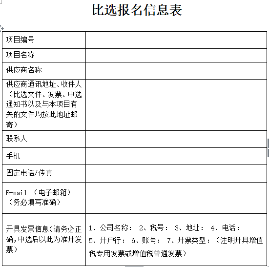 備注:參加本項(xiàng)目比選的供應(yīng)商須到比選代理機(jī)構(gòu)辦理報(bào)名手續(xù)(自備現(xiàn)金)。通過電子郵件報(bào)名的,須將報(bào)名費(fèi)(比選文件費(fèi)用)通過公對公電匯或轉(zhuǎn)帳形式匯入比選公告中寫明的比選代理機(jī)構(gòu)銀行賬戶,同時(shí)將電匯或轉(zhuǎn)賬的銀行回單及填寫完整清晰的下述“比選報(bào)名信息表”蓋公章后發(fā)至比選代理機(jī)構(gòu)郵箱625249263@qq.com。比選代理機(jī)構(gòu)收到后即將比選文件以電子郵件形式發(fā)給供應(yīng)商。未辦理報(bào)名手續(xù)的不受理其投標(biāo)。