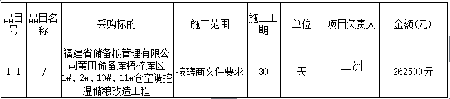 福建省儲(chǔ)備糧管理有限公司莆田儲(chǔ)備庫(kù)梧梓庫(kù)區(qū)1#、2#、10#、11#倉(cāng)空調(diào)控溫儲(chǔ)糧改造工程結(jié)果公告(合同包1)