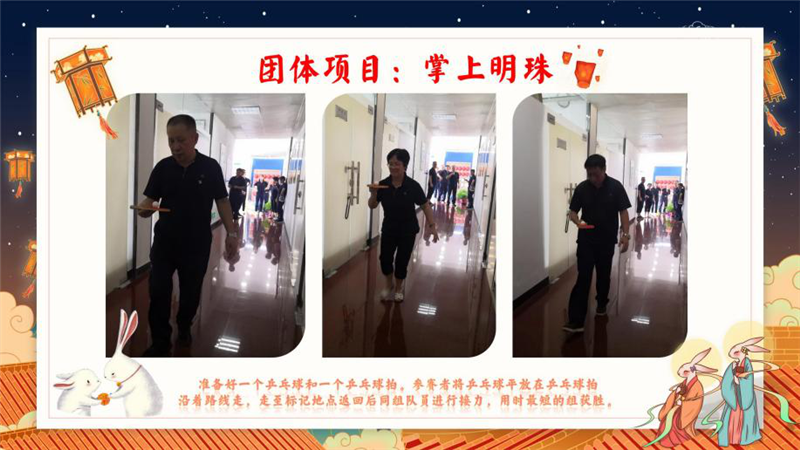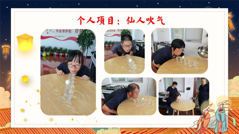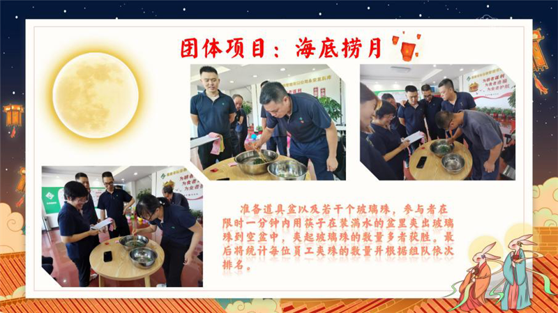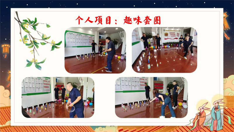 趣味文體活動(dòng)分個(gè)人及團(tuán)隊(duì)兩項(xiàng)內(nèi)容:個(gè)人項(xiàng)目猜燈謎、趣味套圈、仙人吹氣;團(tuán)體項(xiàng)目海底撈月、掌上明珠等豐富多彩的活動(dòng)。在猜燈謎環(huán)節(jié),謎底融入了糧食文化、倉(cāng)儲(chǔ)工作、安全生產(chǎn)等內(nèi)容,極具知識(shí)性和趣味性,讓員工在歡樂(lè)、文明、和諧的氛圍中感受中秋佳節(jié)濃郁的節(jié)日氛圍,緩解工作壓力,增強(qiáng)團(tuán)隊(duì)合作,拉近單位與員工之間的距離,提高單位的凝聚力、向心力和戰(zhàn)斗力。