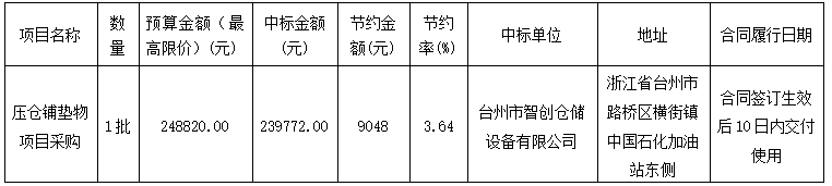 經(jīng)詢(xún)價(jià)小組評(píng)審,最后確定福建省儲(chǔ)備糧管理有限公司建寧直屬庫(kù)壓倉(cāng)鋪墊物項(xiàng)目采購(gòu)中標(biāo)供應(yīng)商為臺(tái)州市智創(chuàng)倉(cāng)儲(chǔ)設(shè)備有限公司,具體情況如下: