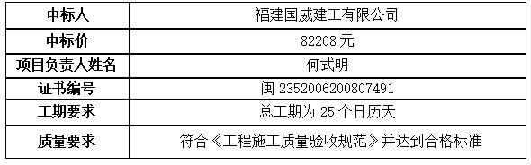 福建省儲備糧管理有限公司晉江直屬庫罩棚修繕工程招標于 2023年10月31日在 福建省申富項目管理有限公司(泉州市經(jīng)濟開發(fā)區(qū)德泰路328號萬興大廈501室) 開標并于2023年11月01日發(fā)布中標候選人公示,公示期已滿,現(xiàn)將中標結果公示如下:
