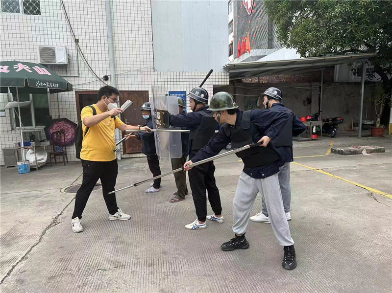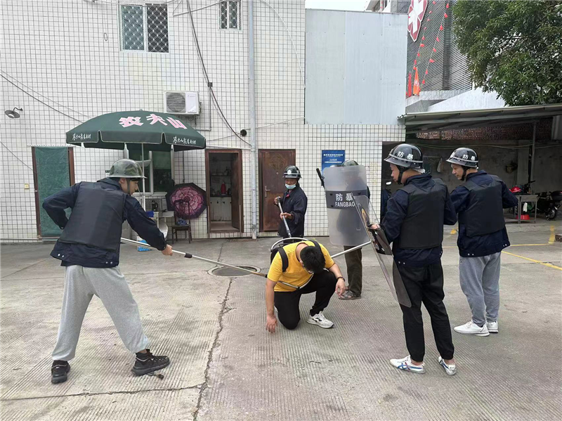 值班人員在巡邏時(shí)第一時(shí)間發(fā)現(xiàn)異常情況,立即與糧庫物業(yè)安保人員手持鋼叉、盾牌、防暴棍等防暴器材趕到現(xiàn)場(chǎng),與“暴徒”交涉無果后,果斷出擊。在全體人員的緊密配合和協(xié)同作戰(zhàn)下,以迅雷不及掩耳之勢(shì)成功制服“暴徒”,成功處置突發(fā)事件。整個(gè)演練過程緊張有序、配合默契,達(dá)到了預(yù)期效果。