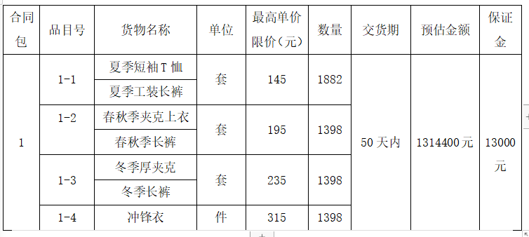 4、報(bào)價(jià)應(yīng)包含貨物(含成衣、配件、輔助材料)生產(chǎn)供應(yīng)、稅金、保管、運(yùn)輸、保險(xiǎn)費(fèi)、產(chǎn)品包裝費(fèi)、檢測(cè)、售后服務(wù)、驗(yàn)收費(fèi)、更換費(fèi)用以及供貨前上門量體定做等費(fèi)用。投標(biāo)人一旦確定中標(biāo),采購人將不會(huì)對(duì)其投標(biāo)報(bào)價(jià)做出其他補(bǔ)償,不再支付任何費(fèi)用。上述費(fèi)用要求中明確或未明確的所發(fā)生的一切費(fèi)用均應(yīng)包含在報(bào)價(jià)總價(jià)中。