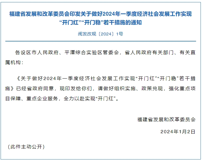 福建省發(fā)展和改革委員會印發(fā)關(guān)于做好2024年一季度經(jīng)濟(jì)社會發(fā)展工作實現(xiàn)“開門紅”“開門穩(wěn)”若干措施的通知