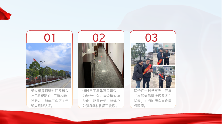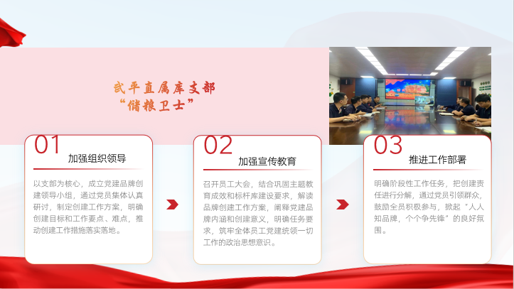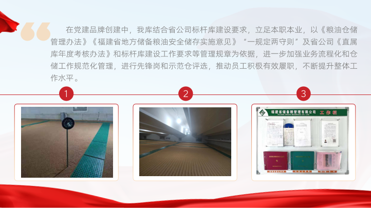 為深入學(xué)習(xí)領(lǐng)會(huì)、貫徹習(xí)近平總書記關(guān)于黨的建設(shè)重要思想,根據(jù)省儲(chǔ)備糧公司黨委“一支部一品牌”的工作部署,2023年,武平直屬庫(kù)大力開展“儲(chǔ)糧衛(wèi)士”黨建品牌創(chuàng)建活動(dòng)。力求通過黨建品牌創(chuàng)建,全面引領(lǐng)直屬庫(kù)各項(xiàng)工作,進(jìn)一步促進(jìn)黨建和業(yè)務(wù)深度融合,進(jìn)一步激勵(lì)黨員干部踔厲奮發(fā),以身作則,發(fā)揮先鋒模范作用,帶動(dòng)和引領(lǐng)群眾認(rèn)真學(xué)習(xí)、領(lǐng)會(huì)、貫徹習(xí)近平總書記關(guān)于國(guó)家糧食安全重要論述精神,立足管好儲(chǔ)備糧這一本職工作,學(xué)思踐悟,知行合一,發(fā)揚(yáng)“寧流千滴汗,保鮮粒粒糧”的精神,在工作實(shí)踐中積極探索科學(xué)、綠色儲(chǔ)糧技術(shù),爭(zhēng)當(dāng)新時(shí)代“儲(chǔ)糧衛(wèi)士”。
