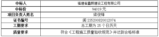 福建省儲(chǔ)備糧管理有限公司晉江直屬庫門廳改造工程招標(biāo)于 2024年04月08日在 福建省申富項(xiàng)目管理有限公司(泉州市經(jīng)濟(jì)開發(fā)區(qū)德泰路328號(hào)萬興大廈501室) 開標(biāo)并于2024年04月08日發(fā)布中標(biāo)候選人公示,公示期已滿,現(xiàn)將中標(biāo)結(jié)果公示如下: