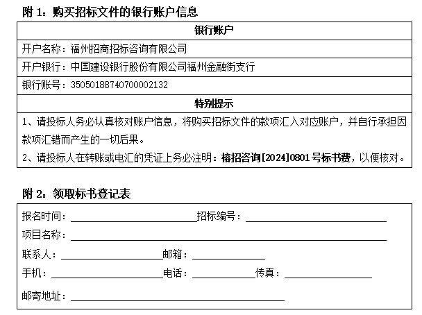 凡有意參加投標(biāo)者,請(qǐng)于 2024 年 8 月 7 日至 2024 年 8 月 13 日(法定公休日、法定節(jié)假日除外),每天上午9時(shí)30分至11時(shí)30分,下午3時(shí)00分至5時(shí)00分(北京時(shí)間,下同),采用不記名方式報(bào)名:①至福州招商招標(biāo)咨詢有限公司【福建省福州市臺(tái)江區(qū)鰲峰街道鰲峰路66號(hào)富閩時(shí)代廣場(chǎng)1#樓16層1602-1603】購(gòu)買招標(biāo)文件,或②將購(gòu)買招標(biāo)文件款匯到本公司賬戶詳見(附1),同時(shí)將電匯底單復(fù)印件及領(lǐng)取招標(biāo)文件登記表(格式詳見附2)寫明后將掃描件發(fā)至(RZZX_ZB@163.COM),未及時(shí)將《領(lǐng)取招標(biāo)文件登記表》發(fā)送至本招標(biāo)代理公司,引起的一切后果由投標(biāo)人自行承擔(dān)。本招標(biāo)代理公司不對(duì)郵寄過(guò)程中可能發(fā)生的延誤或丟失負(fù)責(zé)。