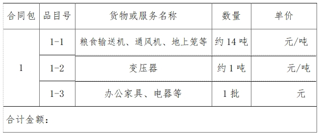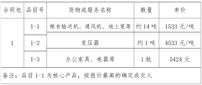 本項(xiàng)目最低起拍價(jià)為:31419元,競(jìng)價(jià)人報(bào)價(jià)不得低于起拍價(jià),否則為無(wú)效競(jìng)價(jià)。其中糧食輸送機(jī)、通風(fēng)機(jī)、地上籠等1533元/噸,變壓器4533元/噸,辦公家具和電器5424元。