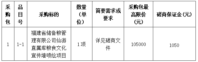 受福建省儲(chǔ)備糧管理有限公司仙游直屬庫(kù)委托,莆田市湄工招標(biāo)代理有限公司對(duì)項(xiàng)目編號(hào):莆湄工[2024]采招第0904-CS、仙游直屬庫(kù)糧食文化宣傳墻噴繪項(xiàng)目組織競(jìng)爭(zhēng)性磋商,現(xiàn)歡迎國(guó)內(nèi)合格的供應(yīng)商前來參加。