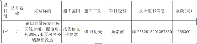 合同包1 莆田直屬庫涵江庫區(qū)綜合樓、配電房、藥劑庫、水泵房等外墻翻新改造:4024元;