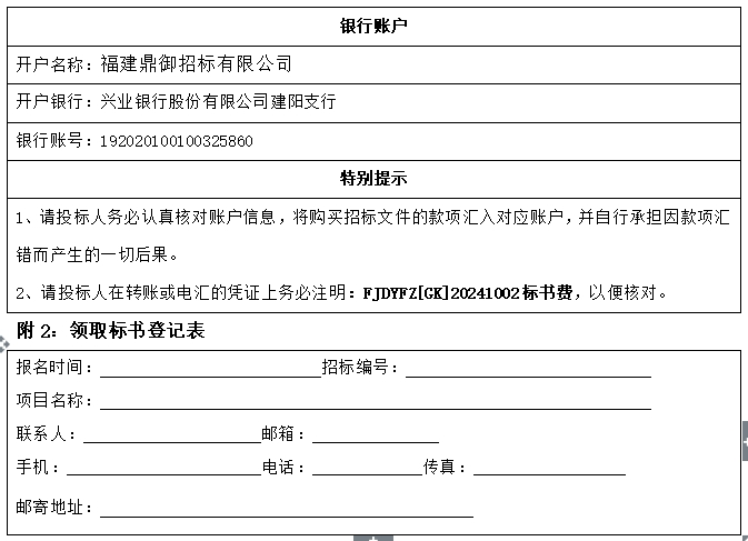 凡有意參加投標(biāo)者,請(qǐng)于2024 年10月17日至 2024 年10月23日(法定公休日、法定節(jié)假日除外),每天上午9時(shí)30分至11時(shí)30分,下午3時(shí)00分至5時(shí)00分(北京時(shí)間,下同):①至福建鼎御招標(biāo)有限公司【福建省福州市鼓樓區(qū)五四路19號(hào)國(guó)泰大廈六樓B區(qū)】購(gòu)買招標(biāo)文件,或②將購(gòu)買招標(biāo)文件款匯到本公司賬戶詳見(附1),同時(shí)將電匯底單復(fù)印件及領(lǐng)取招標(biāo)文件登記表(格式詳見附2)寫明后將掃描件發(fā)至(2539135645@fjdyzb.com),未及時(shí)將《領(lǐng)取招標(biāo)文件登記表》發(fā)送至本招標(biāo)代理公司,引起的一切后果由投標(biāo)人自行承擔(dān)。本招標(biāo)代理公司不對(duì)郵寄過(guò)程中可能發(fā)生的延誤或丟失負(fù)責(zé)。