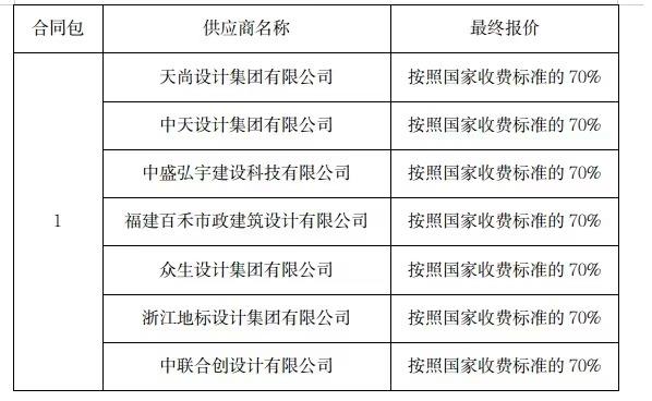 經(jīng)評(píng)標(biāo)小組成員對(duì)各供應(yīng)商響應(yīng)文件進(jìn)行資格性和符合性審查,經(jīng)審核,上述7家供應(yīng)商均通過(guò)資格性審查和符合性審查。根據(jù)征集文件“評(píng)審的標(biāo)準(zhǔn)和方法”的規(guī)定采用綜合評(píng)分法,入圍上限為3家,評(píng)審小組評(píng)議的入圍供應(yīng)商結(jié)果如下:天尚設(shè)計(jì)集團(tuán)有限公司、福建百禾市政建筑設(shè)計(jì)有限公司、中天設(shè)計(jì)集團(tuán)有限公司。