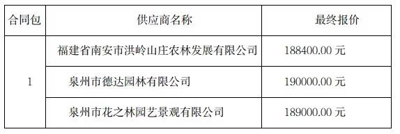 第三成交侯選供應商:泉州市花之林園藝景觀有限公司(最終報價為189000.00元);