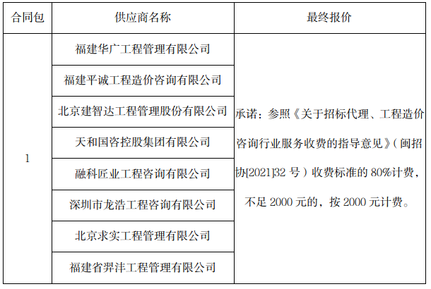 報(bào)名情況:于報(bào)名截止 2025年04月23日18:00共收到以下11家公司的報(bào)名,分別是:福建華廣工程管理有限公司、福建平誠工程造價(jià)咨詢有限公司、北京建智達(dá)工程管理股份有限公司、北京求實(shí)工程管理有限公司、天和國咨控股集團(tuán)有限公司、泉州市中佳項(xiàng)目管理有限公司、中聯(lián)國際工程管理有限公司、深圳市龍浩工程咨詢有限公司、福建省正大青商工程造價(jià)咨詢有限公司、融科匠業(yè)工程咨詢有限公司、福建省羿灃工程管理有限公司。