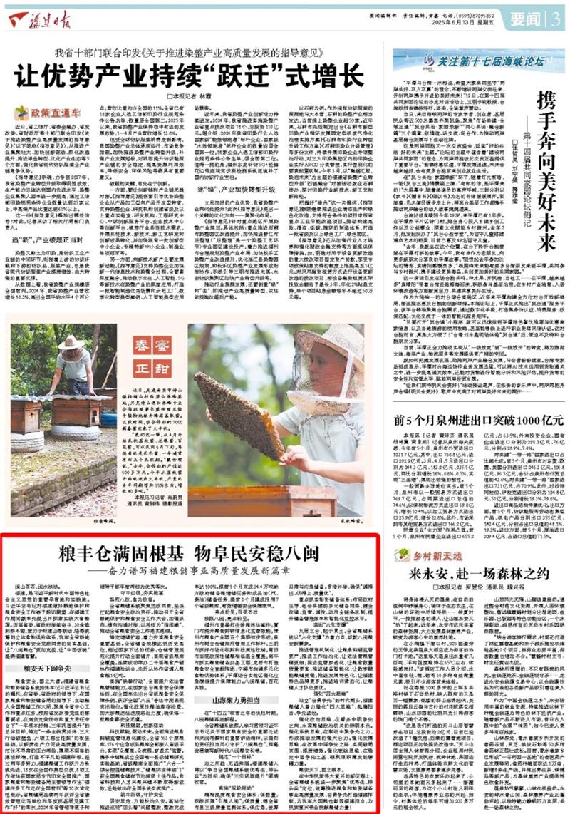 6月13日,福建日?qǐng)?bào)3版刊發(fā)《糧豐倉(cāng)滿(mǎn)固根基 物阜民安穩(wěn)八閩——奮力譜寫(xiě)福建糧儲(chǔ)事業(yè)高質(zhì)量發(fā)展新篇章》