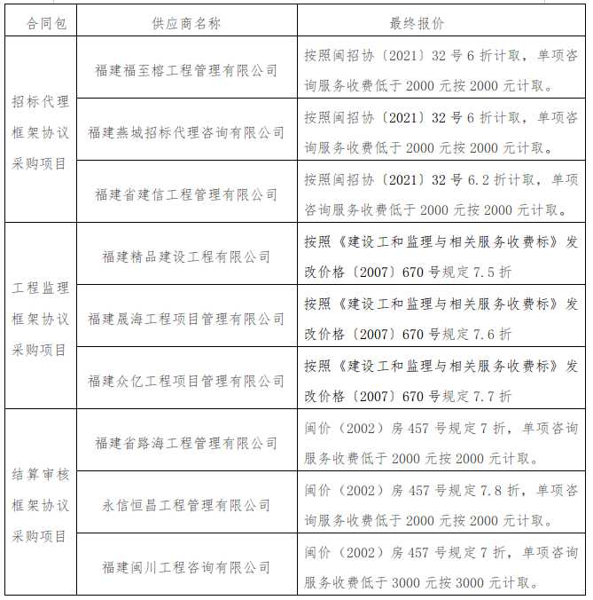 3.工程結(jié)算審核框架協(xié)議采購項目:截止2025年7月22日18:00分收到響應文件5家,福建省路海工程管理有限公司、永信恒昌工程管理有限公司、福建閩川工程咨詢有限公司、福建宏亮工程管理有限公司、新恒豐咨詢集團有限公司。