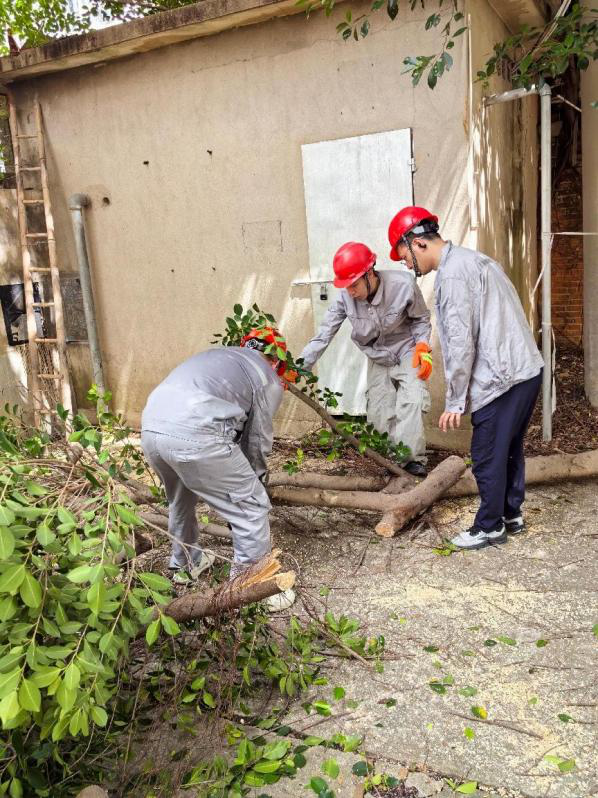 全體人員對(duì)庫(kù)區(qū)所有樹木開展全面、細(xì)致排查,將生長(zhǎng)態(tài)勢(shì)不穩(wěn)定、可能存在安全隱患的樹木進(jìn)行加固處理和樹木修剪清掘作業(yè),并清運(yùn)倒伏樹木殘枝,消除潛在隱患。