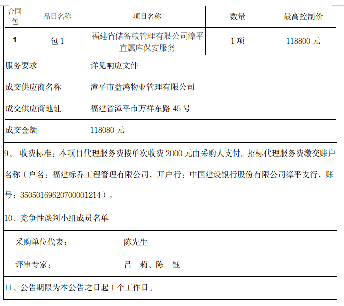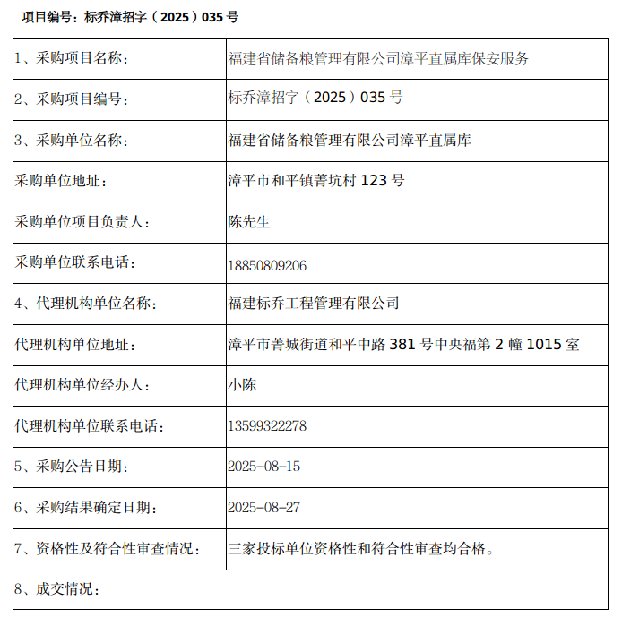 福建省儲(chǔ)備糧管理有限公司漳平直屬庫(kù)保安服務(wù)采購(gòu)服務(wù)成交結(jié)果公告