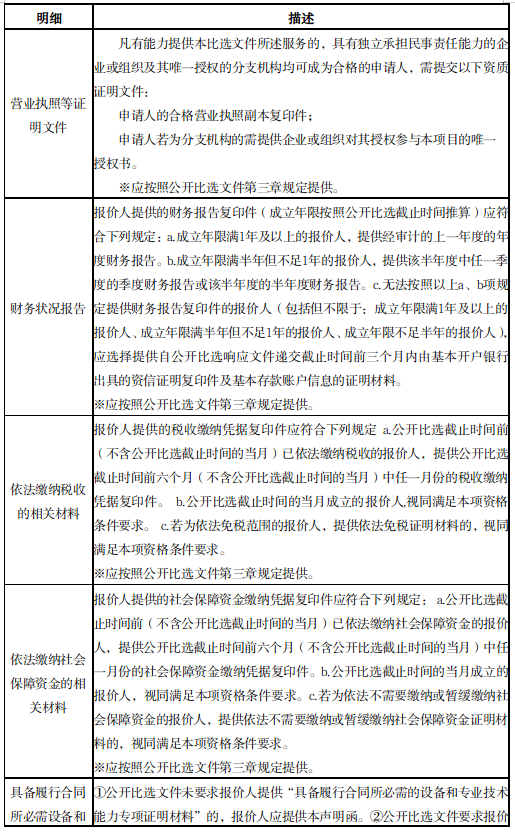 (五)報(bào)價(jià)人必須滿(mǎn)足本公開(kāi)比選文件所述對(duì)應(yīng)的所有資格條件,有任何一條不滿(mǎn)足,都將導(dǎo)致其公開(kāi)比選響應(yīng)文件按無(wú)效處理。所有資格證明文件應(yīng)是最新、有效、完整、清晰。有變更事宜的,變更文件應(yīng)附齊全,否則按無(wú)效處理。