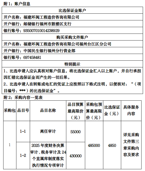 ①兩個(gè)品目單獨(dú)報(bào)價(jià),每個(gè)項(xiàng)目都不得超過預(yù)算金額,審計(jì)費(fèi)用發(fā)票單獨(dú)開具。