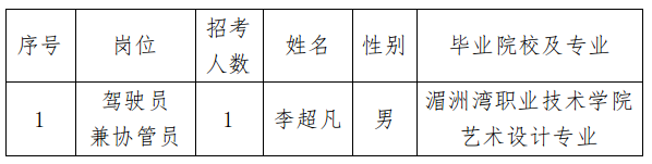 根據(jù)《福建省儲(chǔ)備糧管理有限公司莆田直屬庫駕駛員兼協(xié)管員招聘方案》,經(jīng)報(bào)名、審核篩選、面試、體檢等程序,擬采用勞務(wù)派遣方式聘請(qǐng)1名駕駛員兼協(xié)管員,現(xiàn)予以公示。